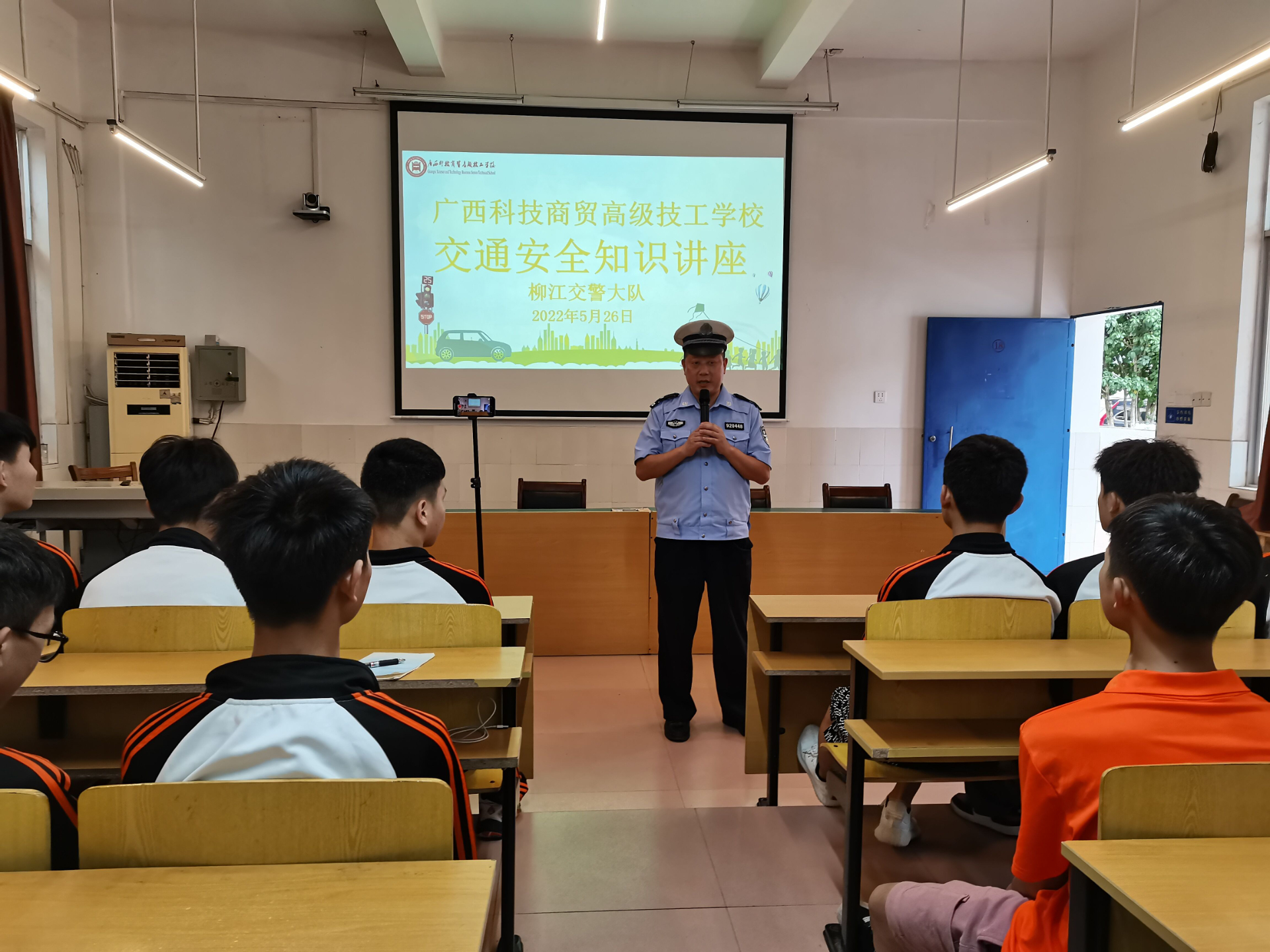 5月26日下午,柳江交警大队到我校举办交通安全知识讲座,交警大队的宣传员结合学校周边交通环境,从如何安全过马路、安全乘车等方面教育学生放学路上不要相互追逐、打闹、嬉戏等注意事项,重点讲解了开展“一盔一带”行动的必要性和重要性。
