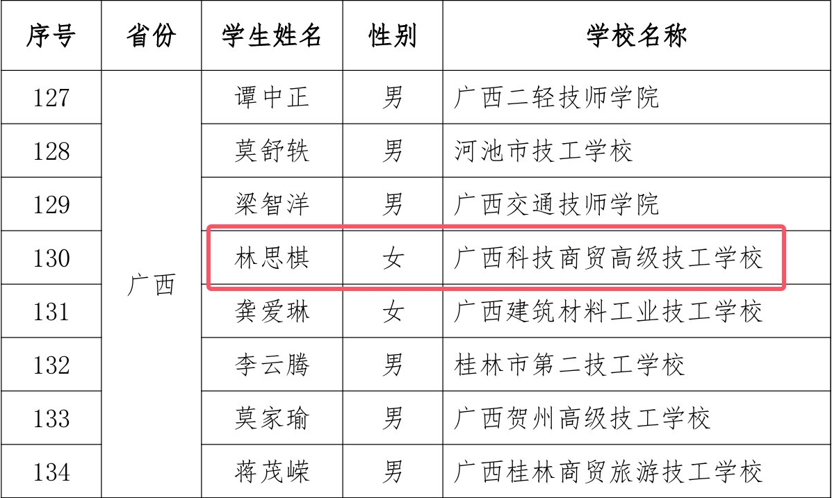 特此报喜!希望全校同学以林思棋为榜样,刻苦钻研技术技能,弘扬精益求精的工匠精神,努力成长为高素质技能人才,为学校争光,为社会贡献力量!