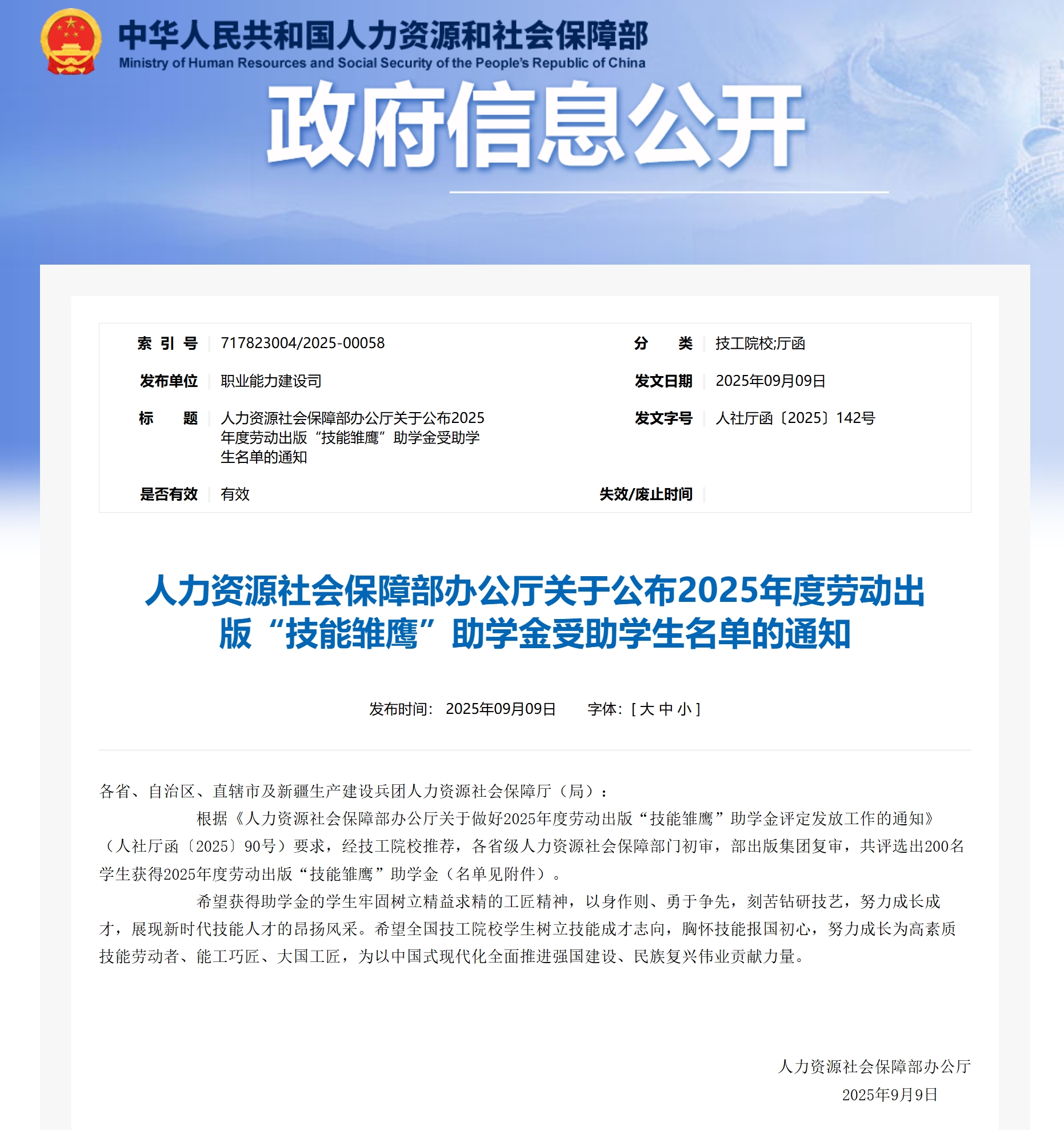 近日,国家人力资源和社会保障部办公厅公布了2025年度劳动出版“技能雏鹰”助学金获奖名单。根据《人力资源社会保障部办公厅关于做好2025年度劳动出版“技能雏鹰”助学金评定发放工作的通知》(人社厅函〔2025〕90号)要求,经层层推荐、严格审定与公示,共有200名优秀学生获此殊荣。