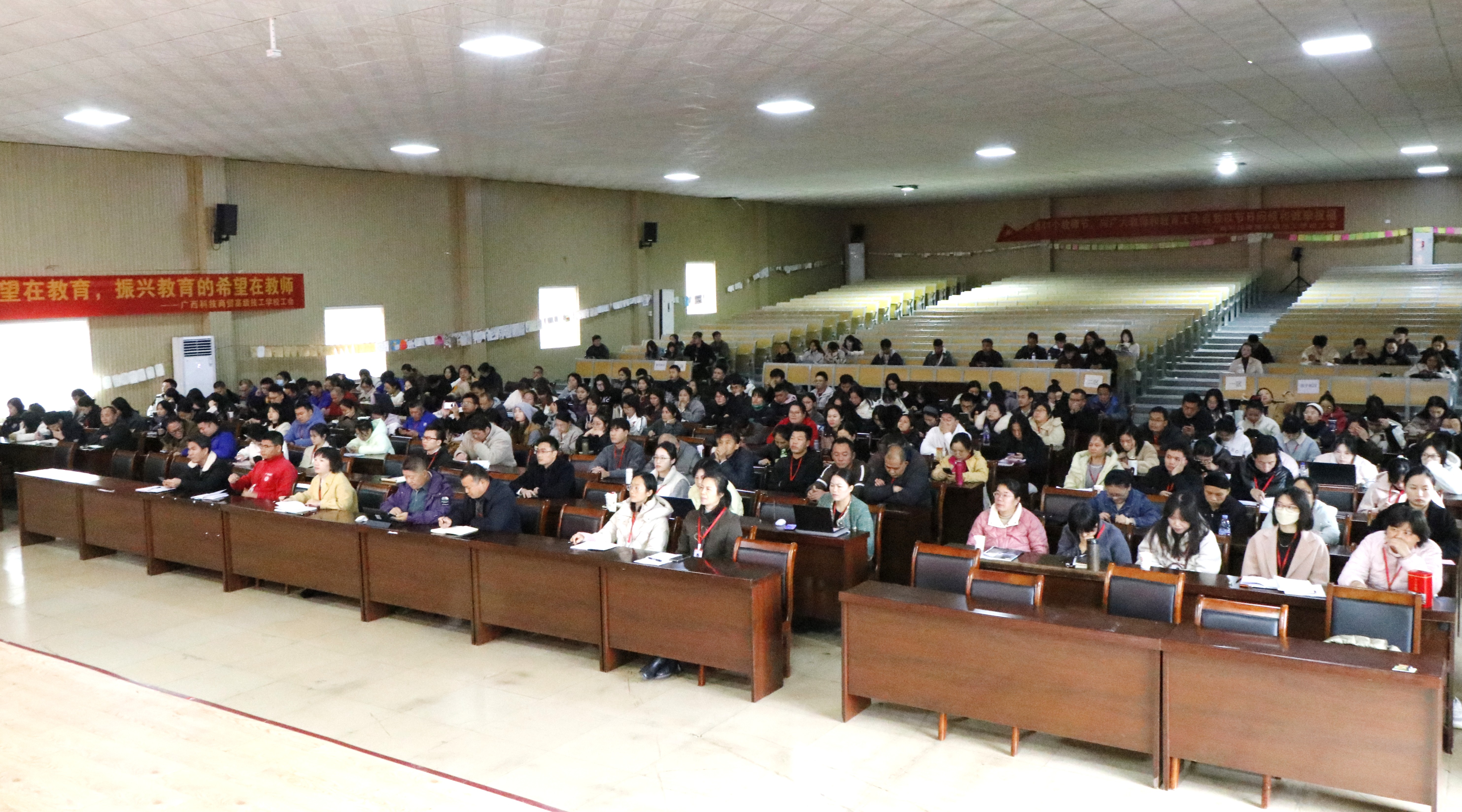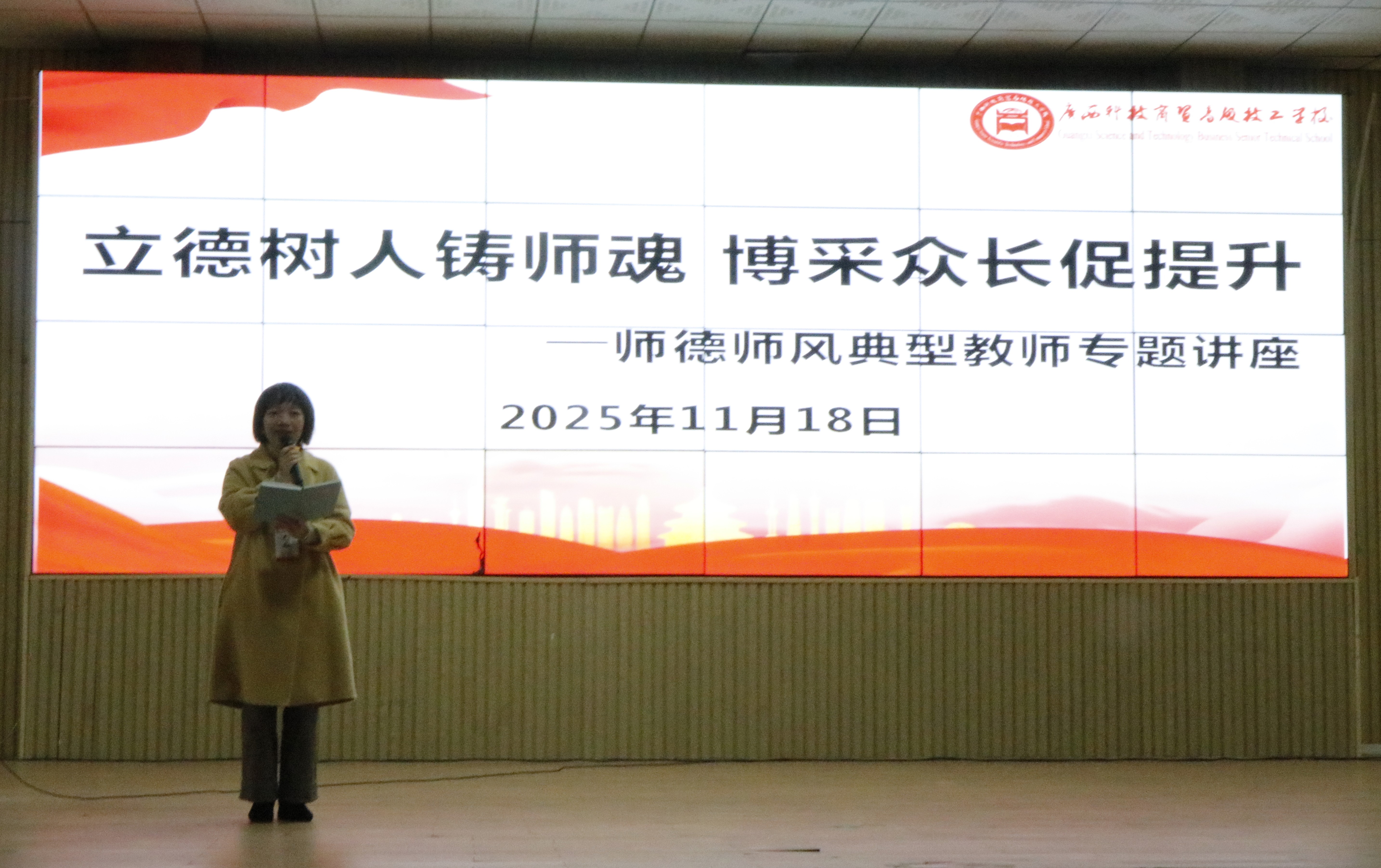 为深入推进师德师风建设,强化教师队伍的思想引领与专业素养,11月18日,我校特邀柳州城市职业学院罗景静副教授,在三合校区大礼堂举办了以“立德树人铸师魂,博采众长促提升”为主题的师德师风建设专题宣讲活动。全体教师参加了此次活动。