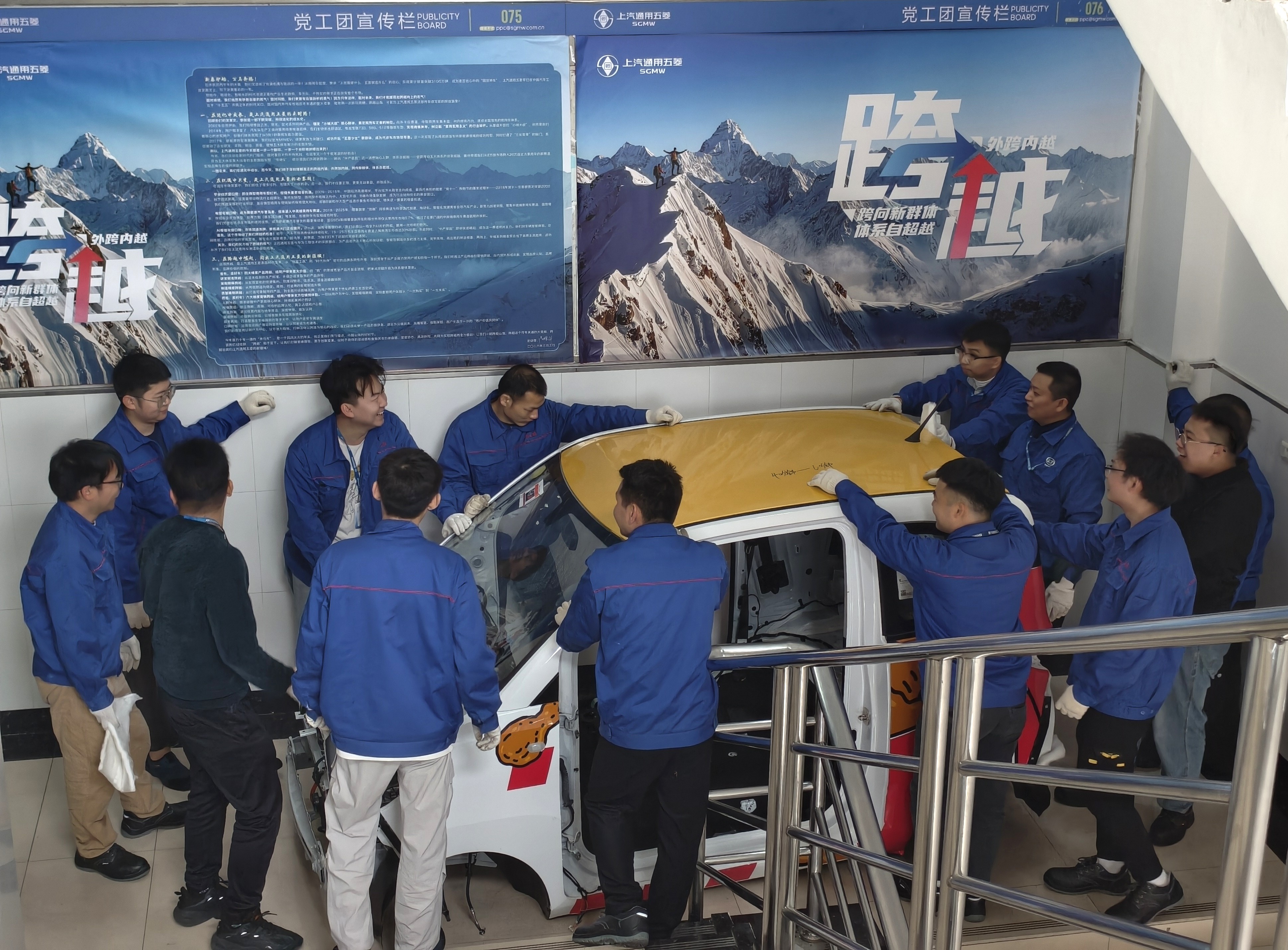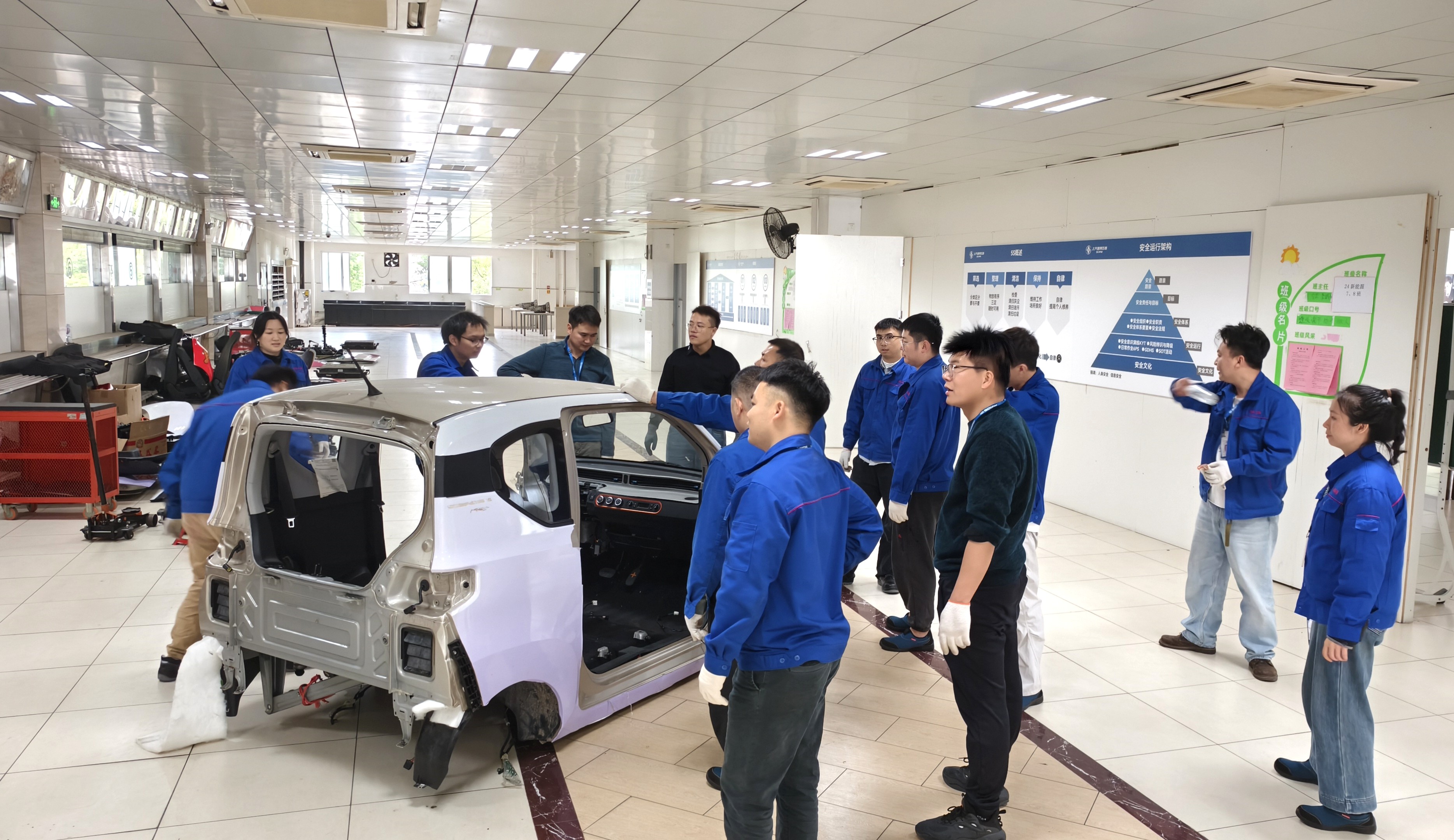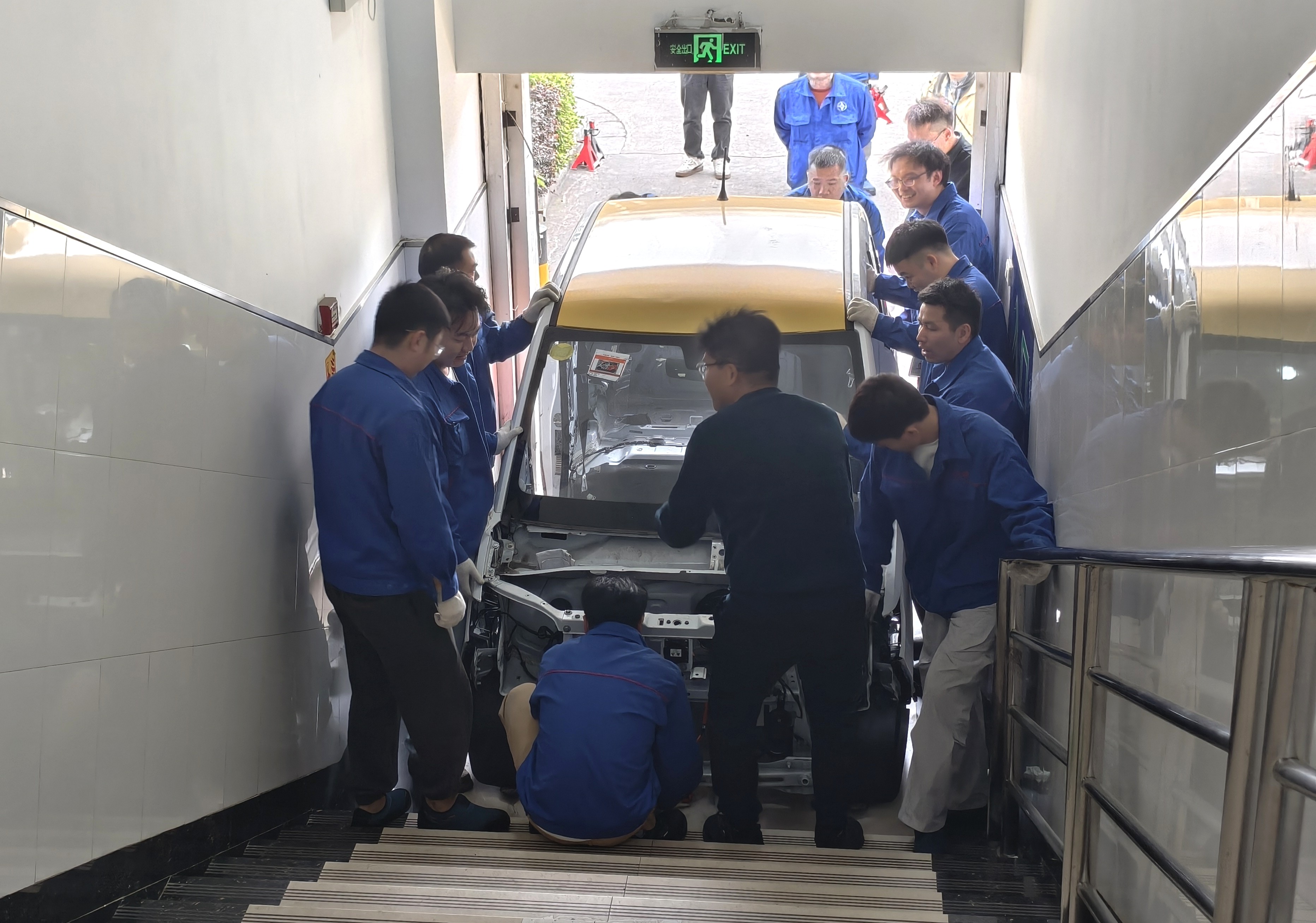 此次任务面临双重挑战:一方面厂区安全管理严格,作业时间、车辆通行及操作流程受限;另一方面旧车搬迁需上楼转运,现场通道狭窄、无吊装设备,新车安置亦须严守厂区标准。学校招就科科长朱金威主动对接,上汽通用五菱产教融合经理赵栋栋及企业领导大力支持,推动工作高效开展。教务科副科长杨胜与企业安保科反复沟通,明确作业方案与安全要求。汽车工程教研室主任姚聪聪带领教师团队放弃周末休息,在企业安全员全程指导下,严格遵守规范,以人力拆解、肩扛手抬方式完成旧车拆卸、搬运、上楼复位及新车精准安置,全程安全高效。