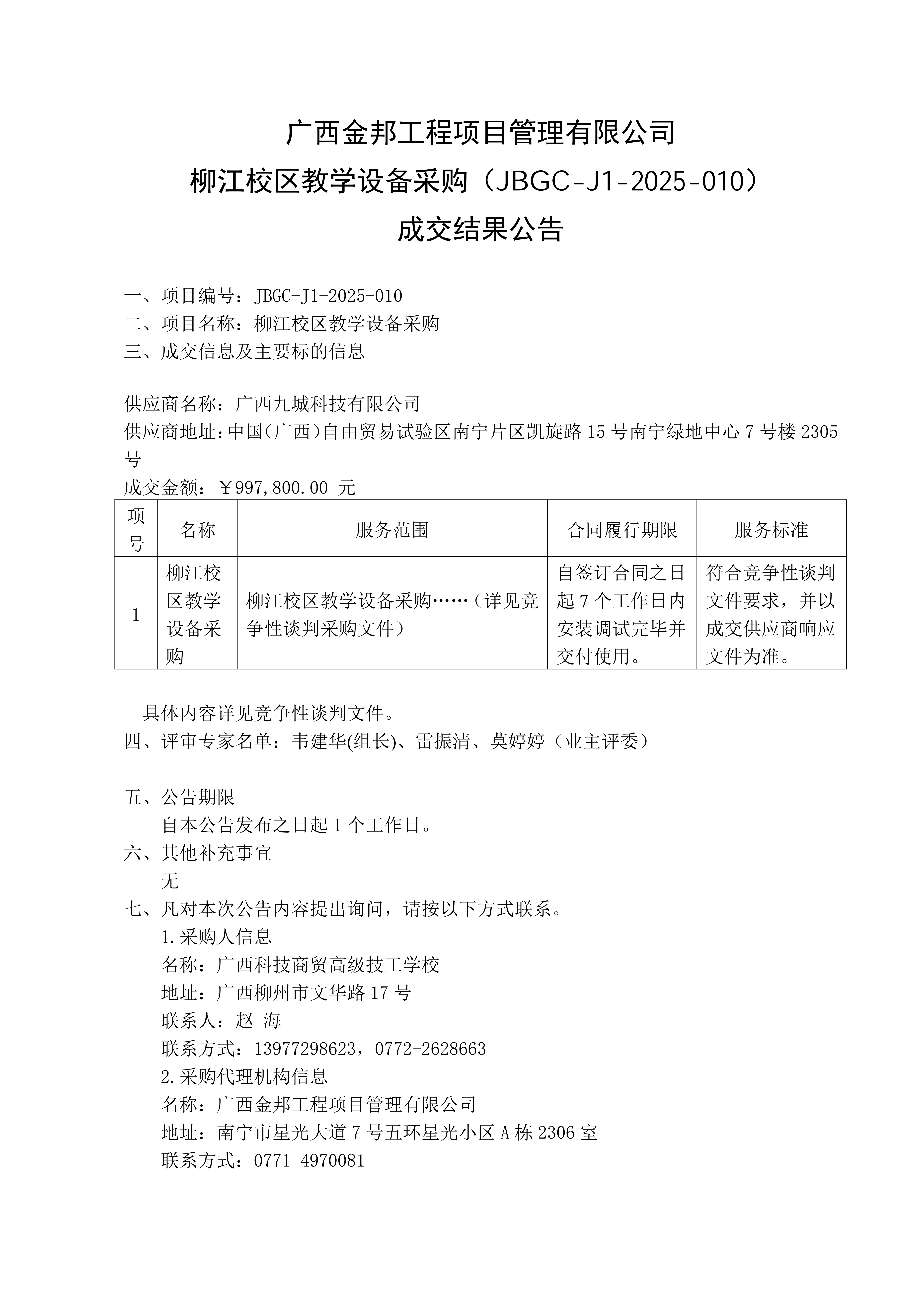 柳江校区教学设备采购成交结果公告